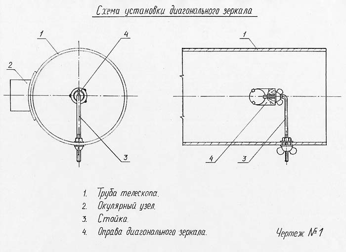 Оправа диагонального зеркала представляет собой цилиндр диаметром немного больше малой оси зеркала. Он выточен из дерева твердой породы, срезан под углом 45° и снабжен тремя лапками, которые удерживают зеркальце. Цилиндр накручивается по резьбе на стойку из латунного прутка диаметром 6 мм, имеющую форму буквы "Г" и стопорится гайкой-барашком. Стойка установлена в трубе телескопа под углом 90 к оси окулярного узла (см. чертеж №1). После некоторых размышлений я пришел к выводу, что такое расположение диагонального зеркала дает большее число степеней свободы при юстировке и позволяет применить более простую конструкцию стойки и оправы. "Боковое" расположение стойки с диагональным зеркалом предлагал в свое время Д.Д.Максутов (М.С.Навашин, "Телескоп астронома-любителя", М. 1962г., стр.312, рис.89)