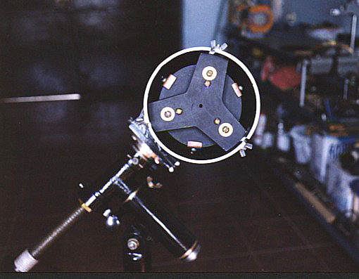 Оправа главного зеркала состоит из двух стальных пластин толщиной 10 мм. На верхней, имеющей форму диска, располагается зеркало, опирающееся на три кружка из фетра и удерживаемое тремя лапками из меди. На нижней пластине, имеющей форму трехлучевой "звезды" находятся юстировочные и стопорные винты, а также три шпильки М6, при помощи которых оправа устанавливается в трубе и фиксируется тремя гайками- барашками.
